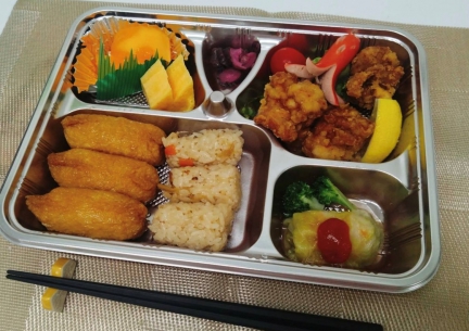 五目いなり寿司は、なんとすべて手包み!栄養部・厨房スタッフで約450個、ひとつひとつ丁寧に包みました。見た目が華やかで大好評でした。
