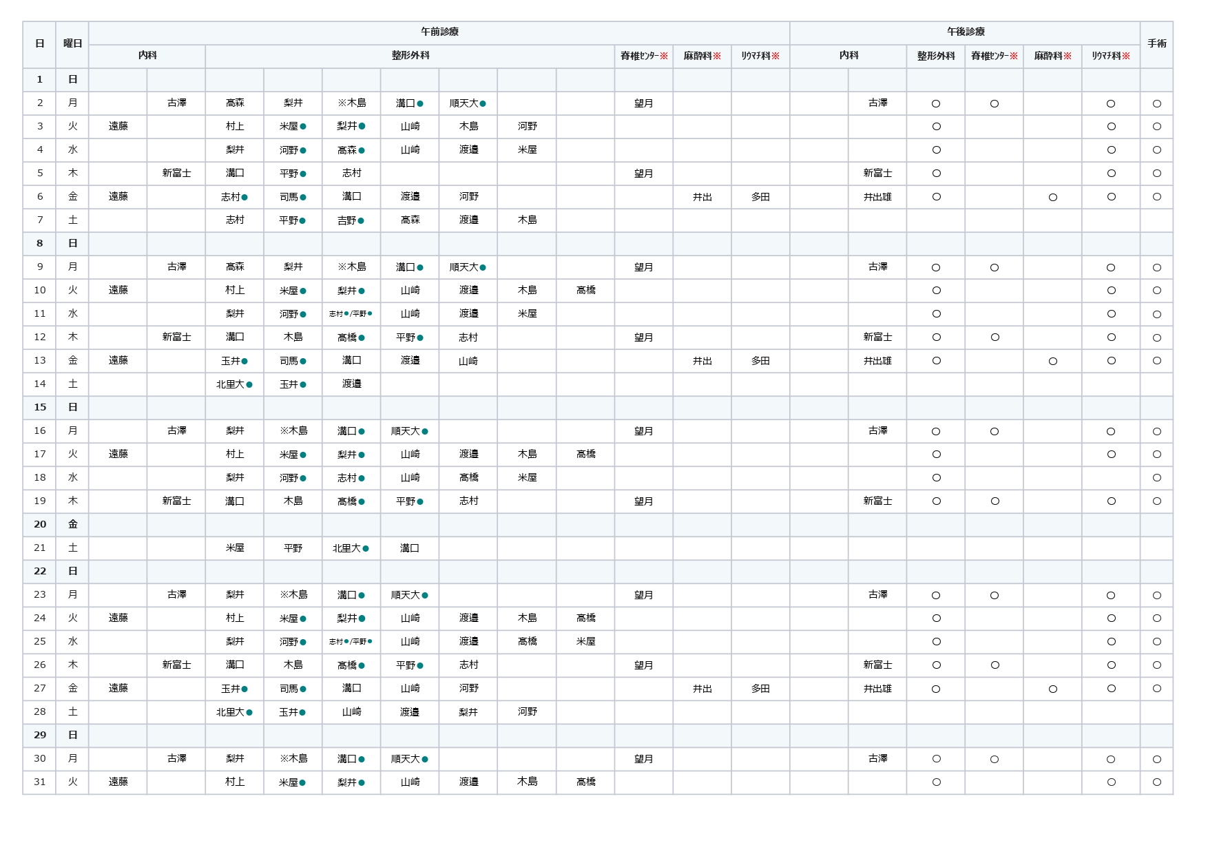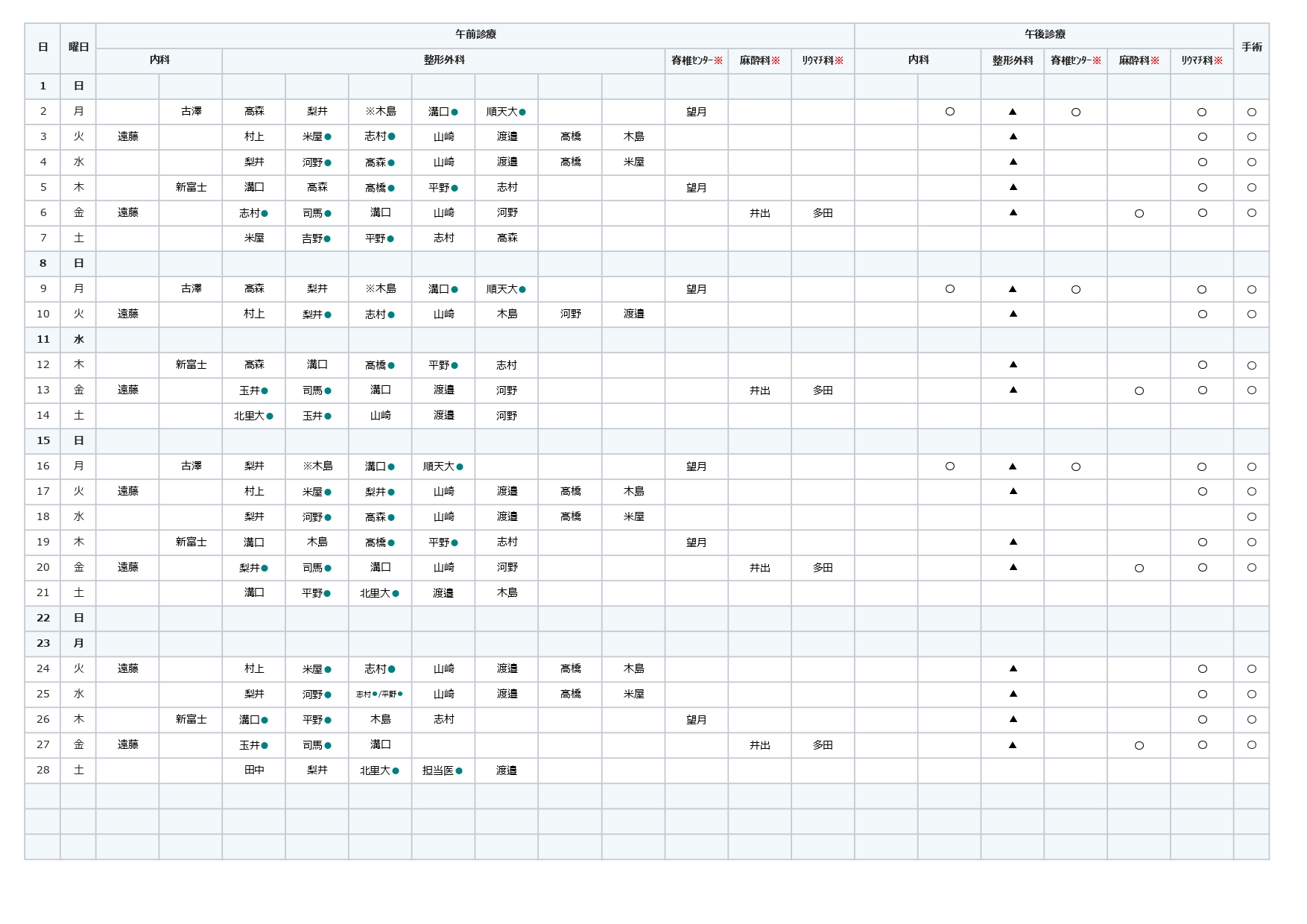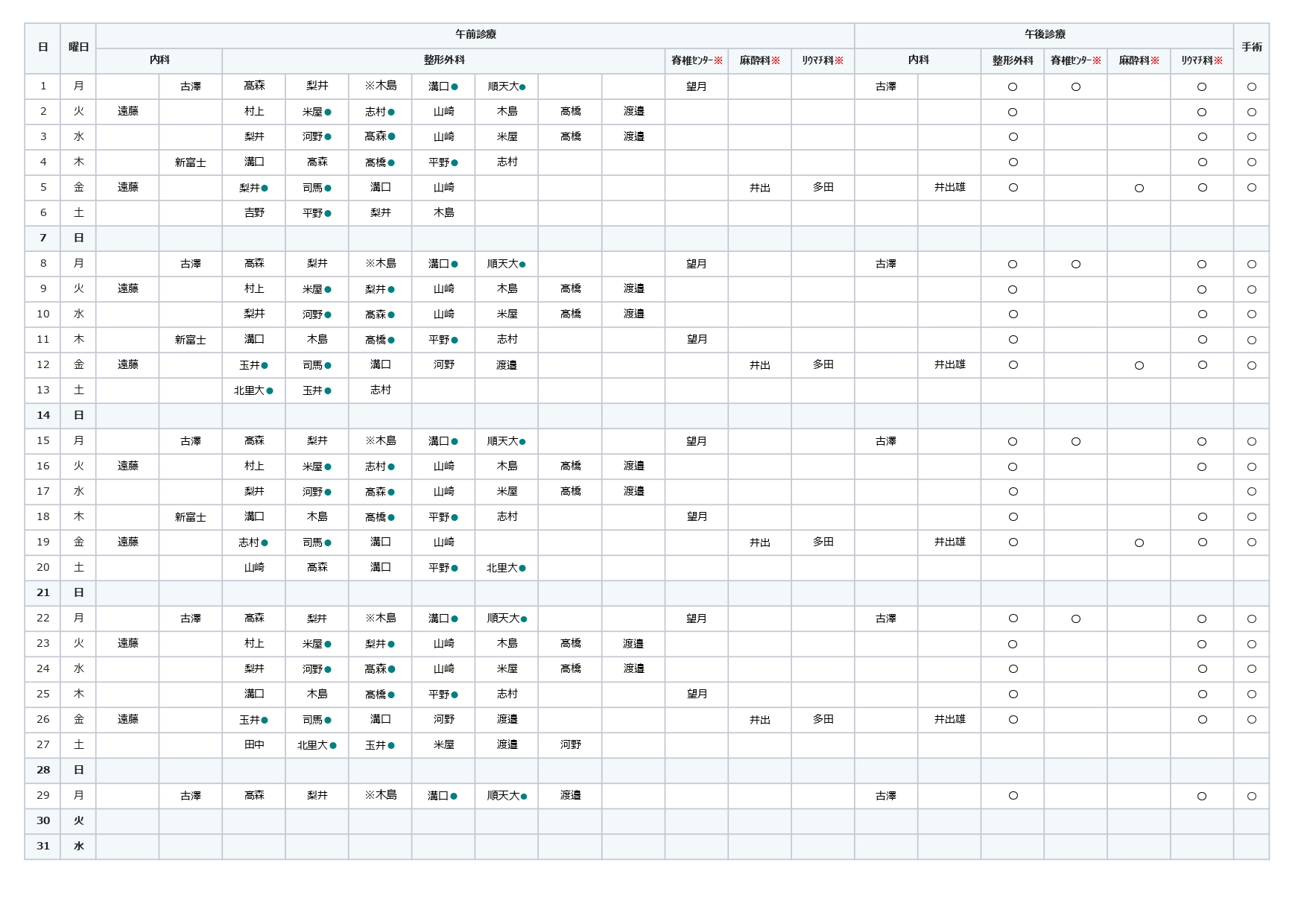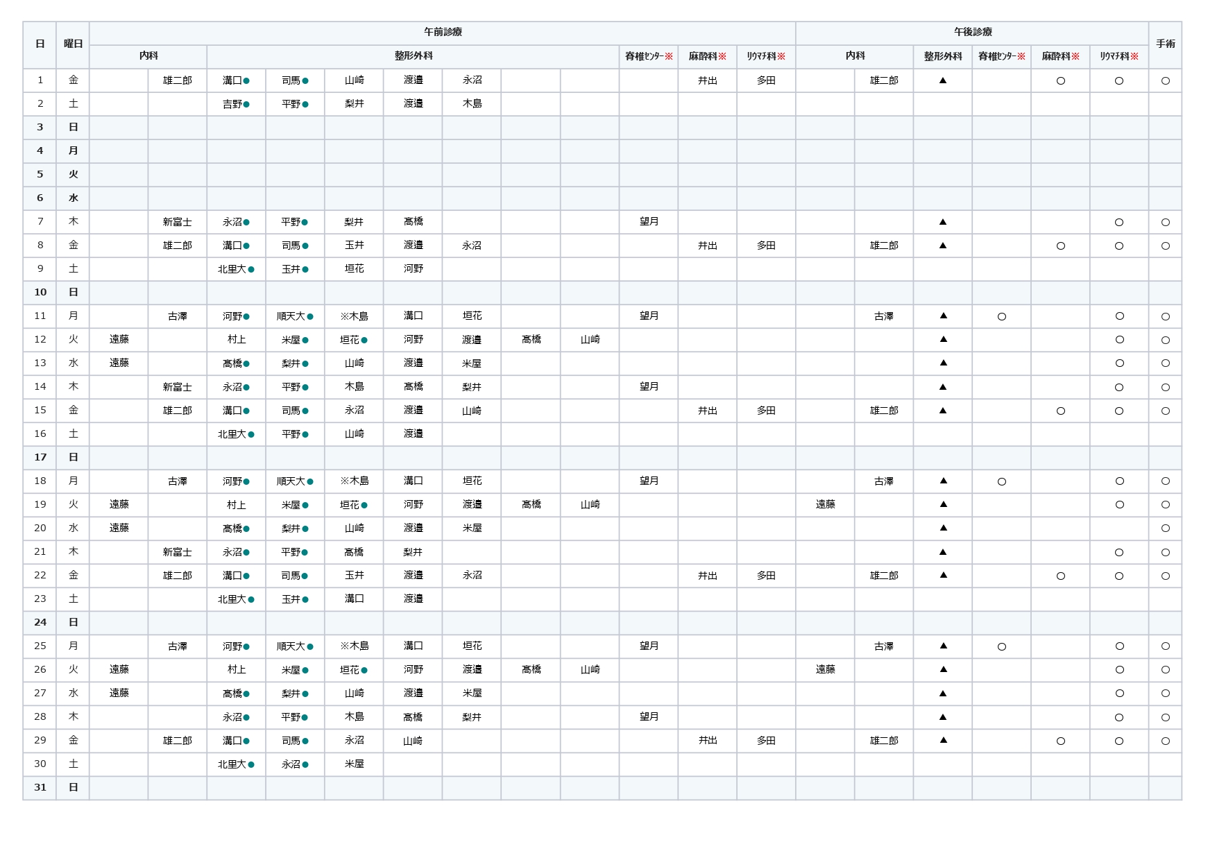 紹介状をお持ちの方、または野球・スポーツ障害の患者様につきましては、※印の日に限り受け付けております。